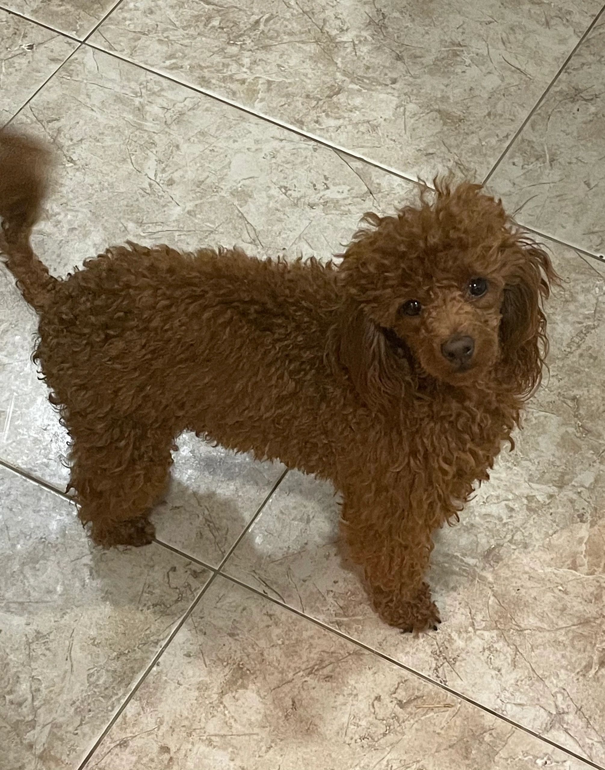 Our color bred red female with a pedigree full of beautiful deep red poodles. She has an amazing personality, calm, devoted and loves to sleep next to us.